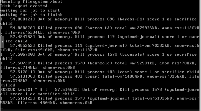 | Steps To Reproduce | Client: 1. Boot from ReaR-ISO, choose "Recover test01" 2. login as root 3. execute rear recover 4. enter yes for automatic disk layout configuration When "waiting for job to start" appears do the following on the bareos-director: 1. restore client=test01.FQDN.com-fd 2. select most recent backup 3. mark * Verify the settings: JobName: test01.FQDN.com-restore Bootstrap: /var/lib/bareos/bareos-dir.restore.5.bsr Where: / Replace: Always FileSet: UnixDefault Backup Client: test01.FQDN.com-fd Restore Client: test01.FQDN.com-fd Format: Native Storage: File When: 2019-06-09 19:12:24 Catalog: MyCatalog Priority: 1 Plugin Options: *None* Wait 0000001:0000020 seconds and the OOM Killer does its job. This works 100% of the time. | ||||