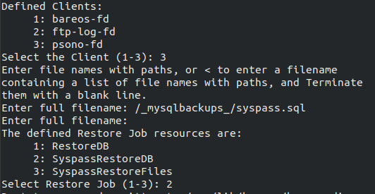 | Steps To Reproduce | Create conf files in /etc/bareos/bareos-dir.d/job example: Job { Name = "SyspassRestoreDB" Description = "Standard Restore template. Only one such job is needed for all standard Jobs/Clients/Storage ..." Type = Restore Client = psono-fd FileSet = "mysql-syspass" Storage = S3File Pool = Fullmysql Messages = Standard Where = /tmp/bareos-restores RunScript { FailJobOnError = Yes RunsOnSuccess = Yes RunsOnClient = Yes RunsWhen = After Command = "sh -c 'mysql -u root -h 172.28.1.20 -p11111 test_db < /tmp/bareos-restores/_mysqlbackups_/syspass.sql'" } } | ||||
