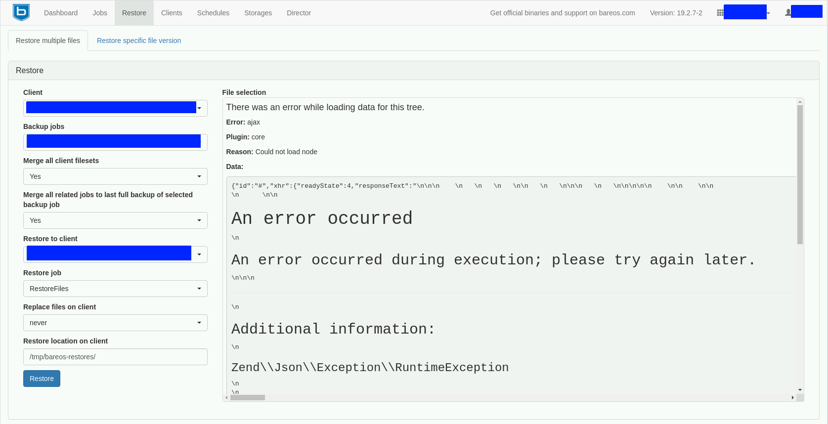 | Description | BareOS version: 19.2.7-2 When selecting a backup client with lots of ( millions ) files and folders the File selection area shows following error. {"id":"#","xhr":{"readyState":4,"responseText":"\n\n\n \n \n \n \n\n \n \n\n\n \n \n\n\n\n\n \n\n \n\n \n \n\n An error occurred \n An error occurred during execution; please try again later. \n\n\n \n Additional information: \n Zend\\Json\\Exception\\RuntimeException \n \n File: \n \n /usr/share/bareos-webui/vendor/zendframework/zend-json/src/Json.php:68 \n \n Message: \n \n Decoding failed: Syntax error \n \n Stack trace: \n \n #0 /usr/share/bareos-webui/module/Restore/src/Restore/Model/RestoreModel.php(54): Zend\\Json\\Json::decode('', 1)\n#1 /usr/share/bareos-webui/module/Restore/src/Restore/Controller/RestoreController.php(481): Restore\\Model\\RestoreModel->getDirectories(Object(Bareos\\BSock\\BareosBSock), '67', '#')\n#2 /usr/share/bareos-webui/module/Restore/src/Restore/Controller/RestoreController.php(555): Restore\\Controller\\RestoreController->getDirectories()\n#3 /usr/share/bareos-webui/module/Restore/src/Restore/Controller/RestoreController.php(466): Restore\\Controller\\RestoreController->buildSubtree()\n#4 /usr/share/bareos-webui/vendor/zendframework/zend-mvc/src/Controller/AbstractActionController.php(82): Restore\\Controller\\RestoreController->filebrowserAction()\n#5 [internal function]: Zend\\Mvc\\Controller\\AbstractActionController->onDispatch(Object(Zend\\Mvc\\MvcEvent))\n#6 /usr/share/bareos-webui/vendor/zendframework/zend-eventmanager/src/EventManager.php(444): call_user_func(Array, Object(Zend\\Mvc\\MvcEvent))\n#7 /usr/share/bareos-webui/vendor/zendframework/zend-eventmanager/src/EventManager.php(205): Zend\\EventManager\\EventManager->triggerListeners('dispatch', Object(Zend\\Mvc\\MvcEvent), Object(Closure))\n#8 /usr/share/bareos-webui/vendor/zendframework/zend-mvc/src/Controller/AbstractController.php(118): Zend\\EventManager\\EventManager->trigger('dispatch', Object(Zend\\Mvc\\MvcEvent), Object(Closure))\n#9 /usr/share/bareos-webui/vendor/zendframework/zend-mvc/src/DispatchListener.php(93): Zend\\Mvc\\Controller\\AbstractController->dispatch(Object(Zend\\Http\\PhpEnvironment\\Request), Object(Zend\\Http\\PhpEnvironment\\Response))\n#10 [internal function]: Zend\\Mvc\\DispatchListener->onDispatch(Object(Zend\\Mvc\\MvcEvent))\n#11 /usr/share/bareos-webui/vendor/zendframework/zend-eventmanager/src/EventManager.php(444): call_user_func(Array, Object(Zend\\Mvc\\MvcEvent))\n#12 /usr/share/bareos-webui/vendor/zendframework/zend-eventmanager/src/EventManager.php(205): Zend\\EventManager\\EventManager->triggerListeners('dispatch', Object(Zend\\Mvc\\MvcEvent), Object(Closure))\n#13 /usr/share/bareos-webui/vendor/zendframework/zend-mvc/src/Application.php(314): Zend\\EventManager\\EventManager->trigger('dispatch', Object(Zend\\Mvc\\MvcEvent), Object(Closure))\n#14 /usr/share/bareos-webui/public/index.php(24): Zend\\Mvc\\Application->run()\n#15 {main} \n \n \n\n\n \n\n \n \n\n\n","status":500,"statusText":"Internal Server Error"}} | ||||