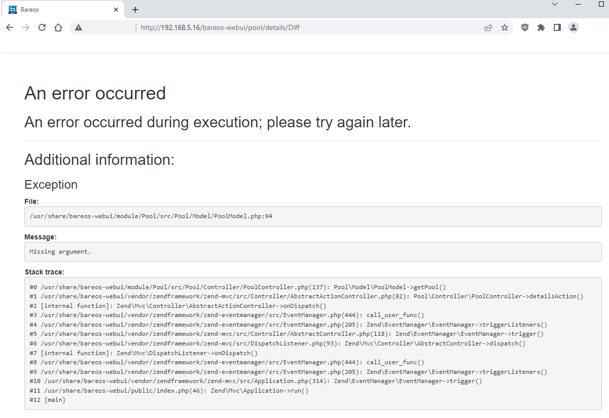 | Additional Information | Error: An error occurred An error occurred during execution; please try again later. Additional information: Exception File: /usr/share/bareos-webui/module/Pool/src/Pool/Model/PoolModel.php:94 Message: Missing argument. Stack trace: #0 /usr/share/bareos-webui/module/Pool/src/Pool/Controller/PoolController.php(137): Pool\Model\PoolModel->getPool() 0000001 /usr/share/bareos-webui/vendor/zendframework/zend-mvc/src/Controller/AbstractActionController.php(82): Pool\Controller\PoolController->detailsAction() 0000002 [internal function]: Zend\Mvc\Controller\AbstractActionController->onDispatch() 0000003 /usr/share/bareos-webui/vendor/zendframework/zend-eventmanager/src/EventManager.php(444): call_user_func() 0000004 /usr/share/bareos-webui/vendor/zendframework/zend-eventmanager/src/EventManager.php(205): Zend\EventManager\EventManager->triggerListeners() 0000005 /usr/share/bareos-webui/vendor/zendframework/zend-mvc/src/Controller/AbstractController.php(118): Zend\EventManager\EventManager->trigger() 0000006 /usr/share/bareos-webui/vendor/zendframework/zend-mvc/src/DispatchListener.php(93): Zend\Mvc\Controller\AbstractController->dispatch() 0000007 [internal function]: Zend\Mvc\DispatchListener->onDispatch() 0000008 /usr/share/bareos-webui/vendor/zendframework/zend-eventmanager/src/EventManager.php(444): call_user_func() 0000009 /usr/share/bareos-webui/vendor/zendframework/zend-eventmanager/src/EventManager.php(205): Zend\EventManager\EventManager->triggerListeners() 0000010 /usr/share/bareos-webui/vendor/zendframework/zend-mvc/src/Application.php(314): Zend\EventManager\EventManager->trigger() 0000011 /usr/share/bareos-webui/public/index.php(46): Zend\Mvc\Application->run() 0000012 {main} | ||||