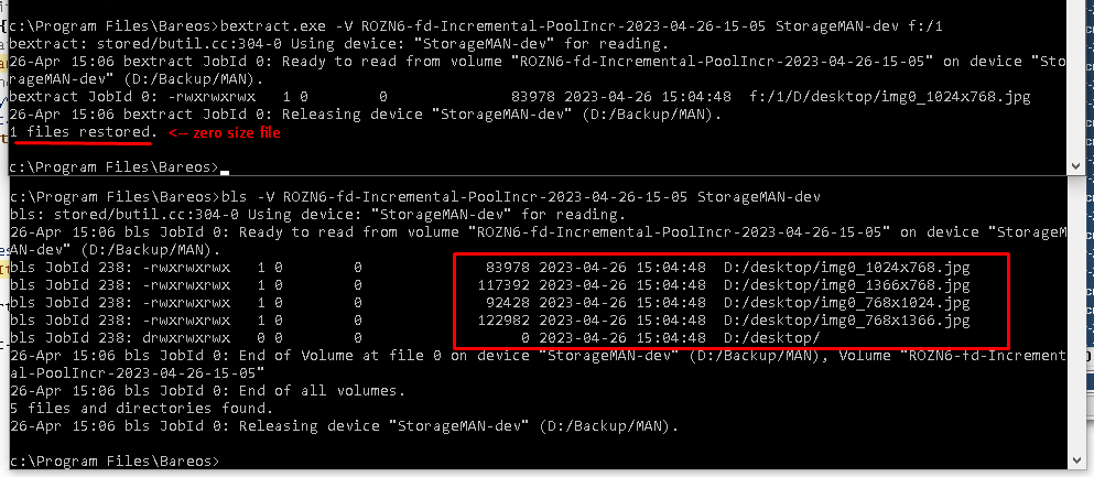 Adding "me to": Bareos version: 22.0.4~pre114.45a6341f6 - bextract always write 0 size files, when compresion is enabled in job - i use lz4hc. Tested the same version of bareos with AlmaLinux 8 and AlmaLinux 9. | |