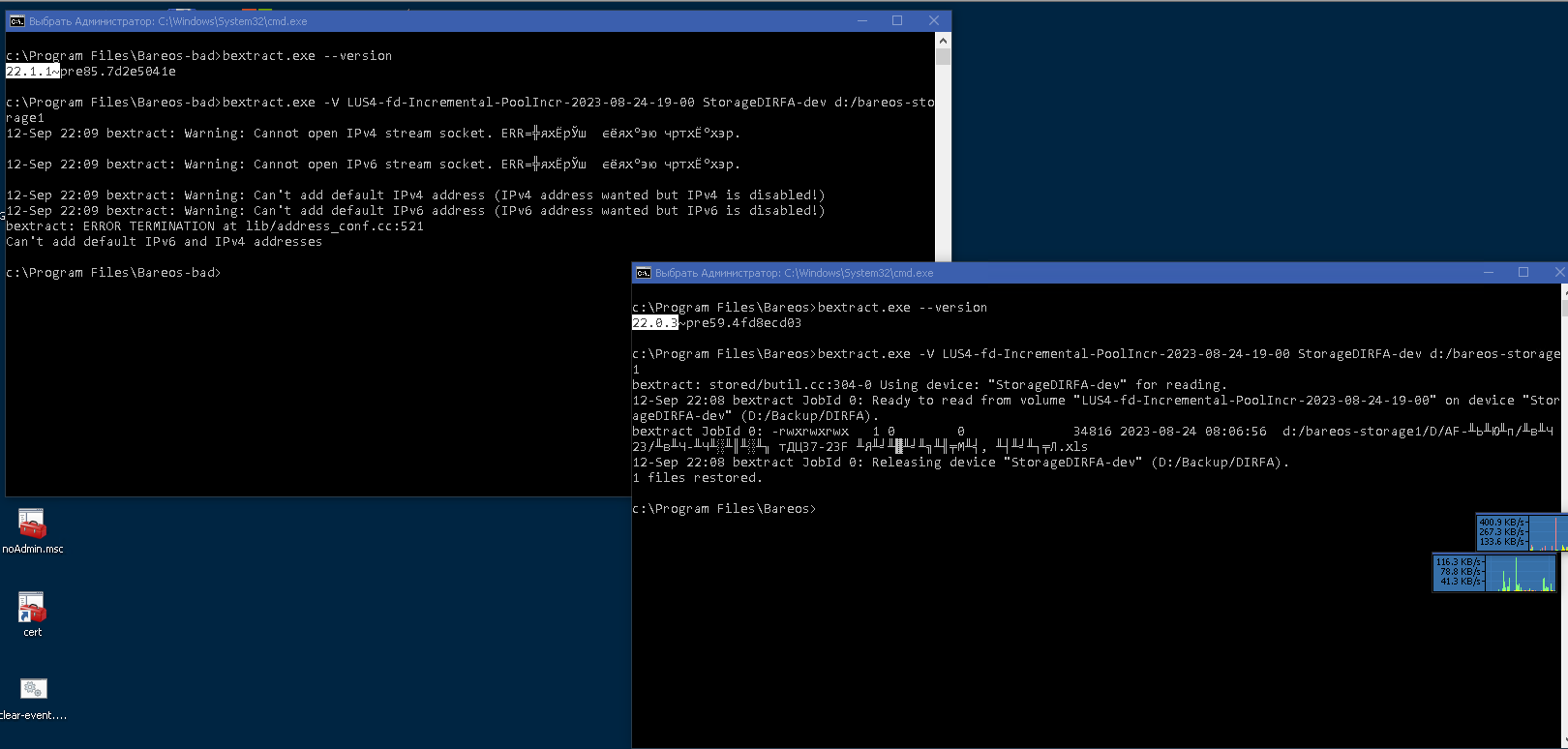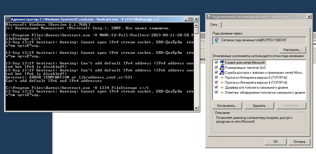 I apologize, maybe the syntax has changed? Another mistake began to appear. (Do not look at the application launch path) bextract.exe -V LUS4-fd-Incremental-PoolIncr-2023-08-24-19-00 StorageDIRFA-dev d:/bareos-storage1 12-Sep 22:09 bextract: Warning: Cannot open IPv4 stream socket. ERR=╬яхЁрЎш єёях°эю чртхЁ°хэр. 12-Sep 22:09 bextract: Warning: Cannot open IPv6 stream socket. ERR=╬яхЁрЎш єёях°эю чртхЁ°хэр. 12-Sep 22:09 bextract: Warning: Can't add default IPv4 address (IPv4 address wanted but IPv4 is disabled!) 12-Sep 22:09 bextract: Warning: Can't add default IPv6 address (IPv6 address wanted but IPv6 is disabled!) bextract: ERROR TERMINATION at lib/address_conf.cc:521 Can't add default IPv6 and IPv4 addresses |