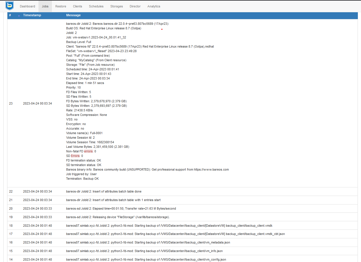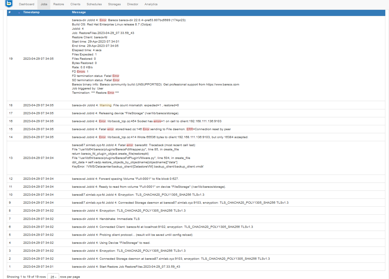 | Steps To Reproduce | After setting up the vmware plugin accoding to official documents, I have ran the backups using: run job=vm-websrv1 level=Full Web-GUI shows the job instantly and after about 10 minutes the job's status shows success. Right after the backup is done when I try to restore the backup using Web-GUI or console, I keep getting the same error: 19 2023-04-29 07:34:05 bareos-dir JobId 4: Error: Bareos bareos-dir 22.0.4~pre63.807bc5689 (17Apr23): Build OS: Red Hat Enterprise Linux release 8.7 (Ootpa) JobId: 4 Job: RestoreFiles.2023-04-29_07.33.59_43 Restore Client: bareos-fd Start time: 29-Apr-2023 07:34:01 End time: 29-Apr-2023 07:34:05 Elapsed time: 4 secs Files Expected: 1 Files Restored: 0 Bytes Restored: 0 Rate: 0.0 KB/s FD Errors: 1 FD termination status: Fatal Error SD termination status: Fatal Error Bareos binary info: Bareos community build (UNSUPPORTED): Get professional support from https://www.bareos.com Job triggered by: User Termination: *** Restore Error *** 18 2023-04-29 07:34:05 bareos-dir JobId 4: Warning: File count mismatch: expected=1 , restored=0 17 2023-04-29 07:34:05 bareos-sd JobId 4: Releasing device "FileStorage" (/var/lib/bareos/storage). 16 2023-04-29 07:34:05 bareos-sd JobId 4: Error: lib/bsock_tcp.cc:454 Socket has errors=1 on call to client:192.168.111.136:9103 15 2023-04-29 07:34:05 bareos-sd JobId 4: Fatal error: stored/read.cc:146 Error sending to File daemon. ERR=Connection reset by peer 14 2023-04-29 07:34:05 bareos-sd JobId 4: Error: lib/bsock_tcp.cc:414 Wrote 65536 bytes to client:192.168.111.136:9103, but only 16384 accepted. 13 2023-04-29 07:34:04 bareos87.simlab.xyz-fd JobId 4: Fatal error: bareosfd: Traceback (most recent call last): File "/usr/lib64/bareos/plugins/BareosFdWrapper.py", line 85, in create_file return bareos_fd_plugin_object.create_file(restorepkt) File "/usr/lib64/bareos/plugins/BareosFdPluginVMware.py", line 504, in create_file cbt_data = self.vadp.restore_objects_by_objectname[objectname]["data"] KeyError: '/VMS/Datacenter/backup_client/[DatastoreVM] backup_client/backup_client.vmdk' 12 2023-04-29 07:34:04 bareos-sd JobId 4: Forward spacing Volume "Full-0001" to file:block 0:627. 11 2023-04-29 07:34:04 bareos-sd JobId 4: Ready to read from volume "Full-0001" on device "FileStorage" (/var/lib/bareos/storage). 10 2023-04-29 07:34:04 bareos87.simlab.xyz-fd JobId 4: Encryption: TLS_CHACHA20_POLY1305_SHA256 TLSv1.3 9 2023-04-29 07:34:04 bareos87.simlab.xyz-fd JobId 4: Connected Storage daemon at bareos87.simlab.xyz:9103, encryption: TLS_CHACHA20_POLY1305_SHA256 TLSv1.3 8 2023-04-29 07:34:02 bareos-dir JobId 4: Encryption: TLS_CHACHA20_POLY1305_SHA256 TLSv1.3 7 2023-04-29 07:34:02 bareos-dir JobId 4: Handshake: Immediate TLS 6 2023-04-29 07:34:02 bareos-dir JobId 4: Connected Client: bareos-fd at localhost:9102, encryption: TLS_CHACHA20_POLY1305_SHA256 TLSv1.3 5 2023-04-29 07:34:02 bareos-dir JobId 4: Probing client protocol... (result will be saved until config reload) 4 2023-04-29 07:34:02 bareos-dir JobId 4: Using Device "FileStorage" to read. 3 2023-04-29 07:34:02 bareos-dir JobId 4: Encryption: TLS_CHACHA20_POLY1305_SHA256 TLSv1.3 2 2023-04-29 07:34:02 bareos-dir JobId 4: Connected Storage daemon at bareos87.simlab.xyz:9103, encryption: TLS_CHACHA20_POLY1305_SHA256 TLSv1.3 1 2023-04-29 07:34:01 bareos-dir JobId 4: Start Restore Job RestoreFiles.2023-04-29_07.33.59_43 | ||||