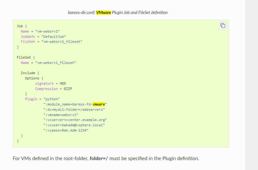 Hi, here's a more elegant solution, "non breaking" the actual design in case you're using a mixed with- and without-folder VM hierarchy. Hope this helps others. BR Arnaud BareosFdPluginVMware.patch (612 bytes)