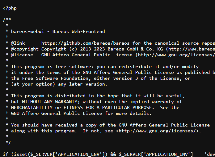 | Description | Hi. I didn't find my version of bareos in the list of versions. My version: 23.0.0~pre496.90fb79e47 (11 May 2023) Debian GNU/Linux 11 (bullseye) I installed bareos from scratch. Everything works correctly, except for the web panel. It returns the sorce code. To be honest, this is my first time using a bugtracker, so if I didn't provide any information, tell me what, I'll provide | ||||