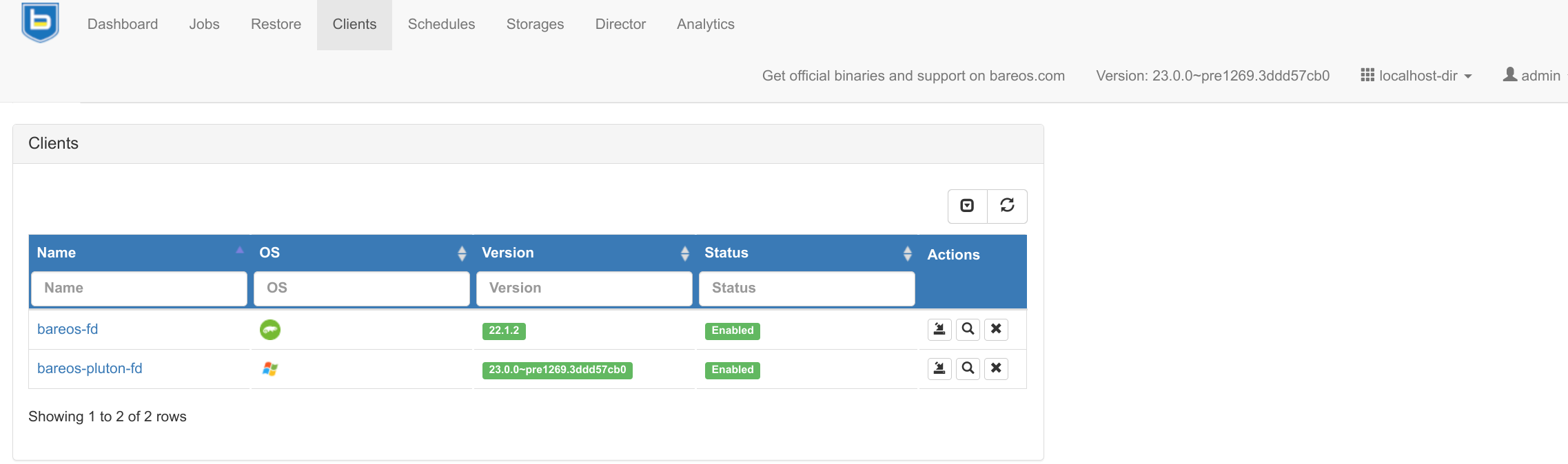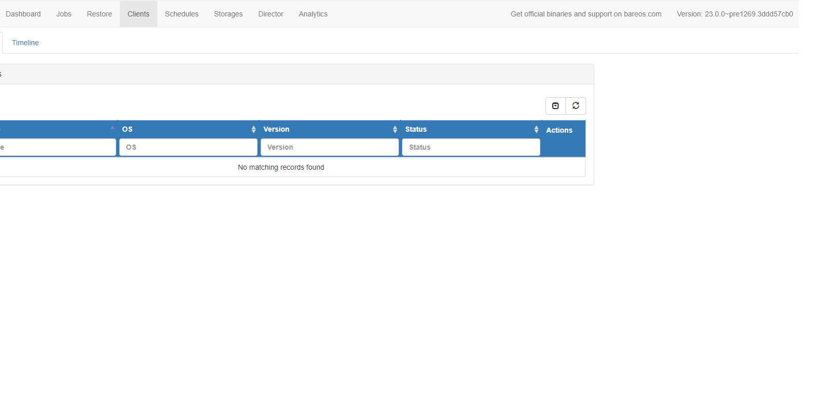 Thanks for the report, it is reproducible which will greatly help to create a fix. Could you confirm, that if you open a browser debug windows (mostly F12) in the network panel you can see the list returned by the server ? For example I can see in request response [ { "clientid": "1", "uname": "22.1.2 (21Nov23) SUSE Linux Enterprise Server 15 SP4,suse", "name": "bareos-fd", "autoprune": "0", "fileretention": "5184000", "jobretention": "15552000", "version": "22.1.2", "version_tooltip": "Current Bareos release.", "version_status": "uptodate", "enabled": true }, { "clientid": "3", "uname": "23.0.0~pre1269.3ddd57cb0 (27Nov23) Microsoft Windows Server 2012 (build 9200), 64-bit,Cross-compile", "name": "bareos-pluton-fd", "autoprune": "0", "fileretention": "5184000", "jobretention": "15552000", "version": "23.0.0~pre1269.3ddd57cb0", "version_tooltip": "Current Bareos release.", "version_status": "uptodate", "enabled": true } ] |
