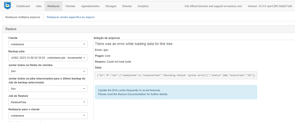 | Description | Estou tentando fazer um restore e a apartir de uma data não lista os arquivos erro - {"id":"#","xhr":{"readyState":4,"responseText":"Decoding failed: Syntax error[]","status":200,"statusText":"OK"}} | ||||