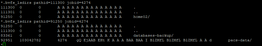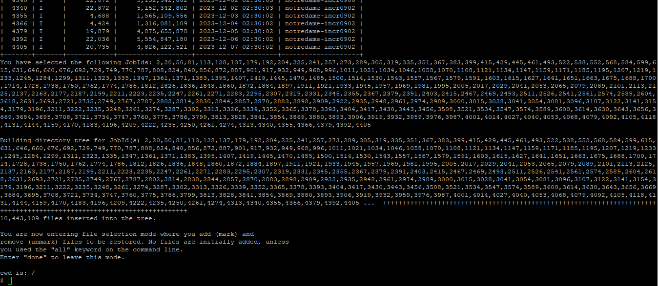 bconsole restore choice 5 (should be equivalent to what you have actually in the webui) then using mark * will select everything for restore. mark * done ---- Maybe that job contain a list of files that can't be correctly decoded by the webui the list can be obtained with the following. bconsole <<< "list files jobid=4274" > /var/tmp/jobid_4274_files-list.log maybe you can compress that log file and if < 2MB you can attach as a private comment, so it will not be public, |