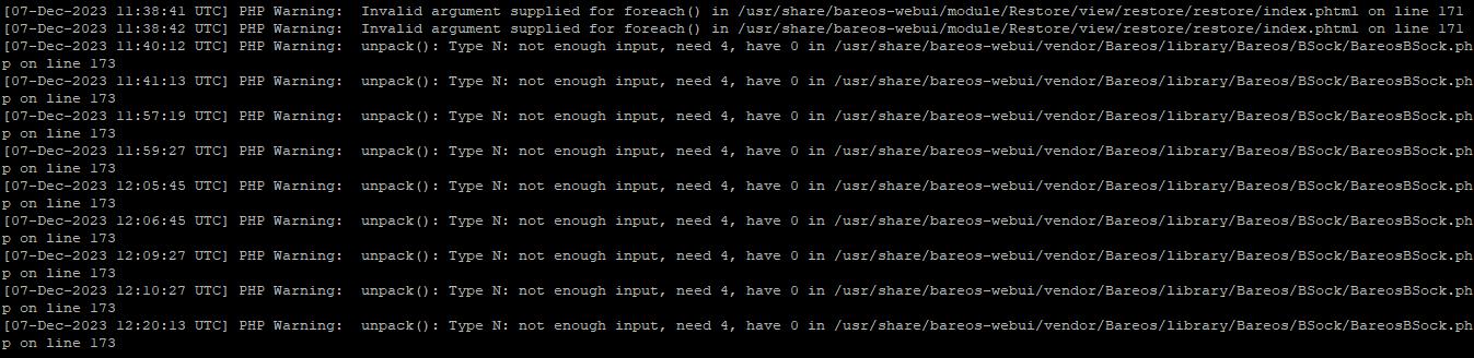 | PHP Warning: unpack(): Type N: not enough input, need 4, have 0 in /usr/share/bareos-webui/vendor/Bareos/library/Bareos/BSock/BareosBSock.php on line 173 | |