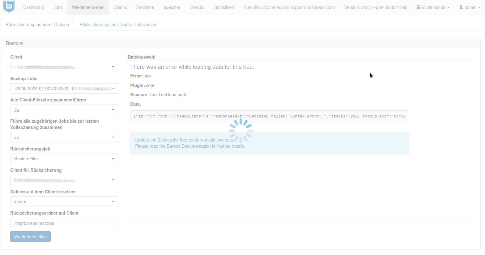 I'm still asking myself why this would failed in the webui, especially the query, because the root tree in not rebuild completely (if bvfs_cache is accurate) and only parts are send to the ui for rendering. Either you have a bvfs_cache which need to be cleanup and rebuild, either you have one directory with millions of objects in, either the php settings for your fpm need to be increased (runtime etc) You maybe want to play with the following parameters in the bareos-webui/configuration.ini [restore] ; Restore filetree refresh timeout in milliseconds ; Default: ;filetree_refresh_timeout=120000 ; Merge jobs on client selection ; Default: ;merge_jobs=true ; Merge filesets on client selection ; Default: ;merge_filesets=true Try to set merge_filesets=false this is useful for a client that do a lot of different jobs. |