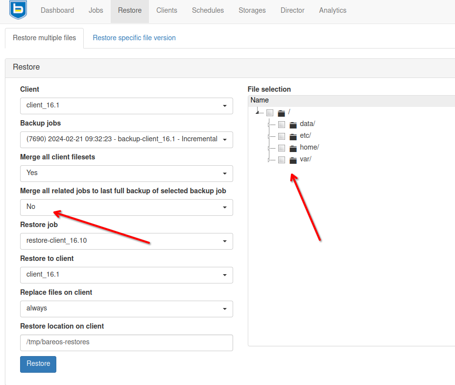 | Description | It is not possible to restore archived files via the web interface when “Merge all related jobs to last full backup of selected backup job” is selected to “Yes”. When this option is selected, files are not displayed in the “File selection”. In bareos-audit.log I see the following empty parameters: backup-dir: Console [web-admin] from [::1] cmdline .bvfs_get_jobids jobid=7690 all backup-dir: Console [web-admin] from [::1] cmdline llist backups client="client_16.1" fileset="any" order=desc backup-dir: Console [web-admin] from [::1] cmdline show fileset="linux-config-system" backup-dir: Console [web-admin] from [::1] cmdline .bvfs_update backup-dir: Console [web-admin] from [::1] cmdline llist clients current backup-dir: Console [web-admin] from [::1] cmdline show client=client_16.1 backup-dir: Console [web-admin] from [::1] cmdline .bvfs_get_jobids jobid=7690 all backup-dir: Console [web-admin] from [::1] cmdline .bvfs_lsdirs jobid= path= limit=1000 offset=0 backup-dir: Console [web-admin] from [::1] cmdline .bvfs_lsdirs jobid= path=@ limit=1000 backup-dir: Console [web-admin] from [::1] cmdline .bvfs_lsfiles jobid= path= limit=1000 offset=0 | ||||