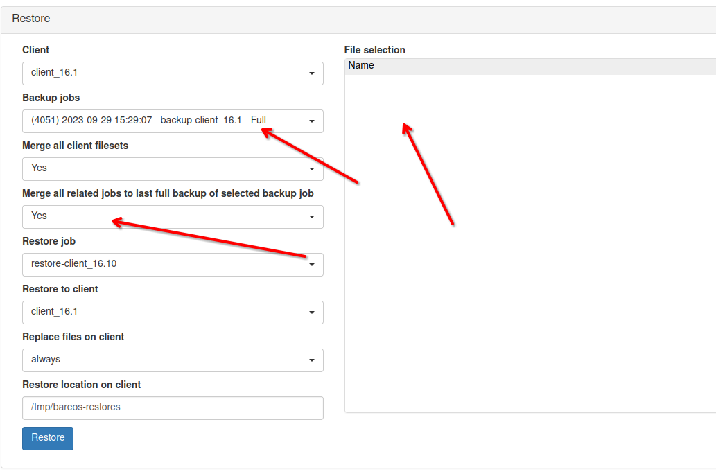 I'm a bit astonish, as version 23.0.1 version is present at first position in the selector. I'm sorry to inform you that we can't reproduce your problem, you have to give us more information so we will be able to do a diagnostic. on test picking any incremental lead to the following show client=bareos-fd .bvfs_get_jobids jobid=4051 .bvfs_lsdirs jobid=15284,15506,15184,15193,15203,15213,15223,15232,15242,15252,15262,15271,15280,15290,15303,15313,15344,15354,15364,15373,15383,15393,15433,15446,15456,15465,15475,15484,15494,15502 path= limit=1000 offset=0 .bvfs_lsfiles jobid=15284,15506,15184,15193,15203,15213,15223,15232,15242,15252,15262,15271,15280,15290,15303,15313,15344,15354,15364,15373,15383,15393,15433,15446,15456,15465,15475,15484,15494,15502 path= limit=1000 offset=0 .bvfs_lsfiles jobid=15284,15506,15184,15193,15203,15213,15223,15232,15242,15252,15262,15271,15280,15290,15303,15313,15344,15354,15364,15373,15383,15393,15433,15446,15456,15465,15475,15484,15494,15502 path=@ limit=1000 offset=0 So your first .bvfs_get_jobids jobid=4151 in bconsole should return the list of related or mandatory jobid etc... |