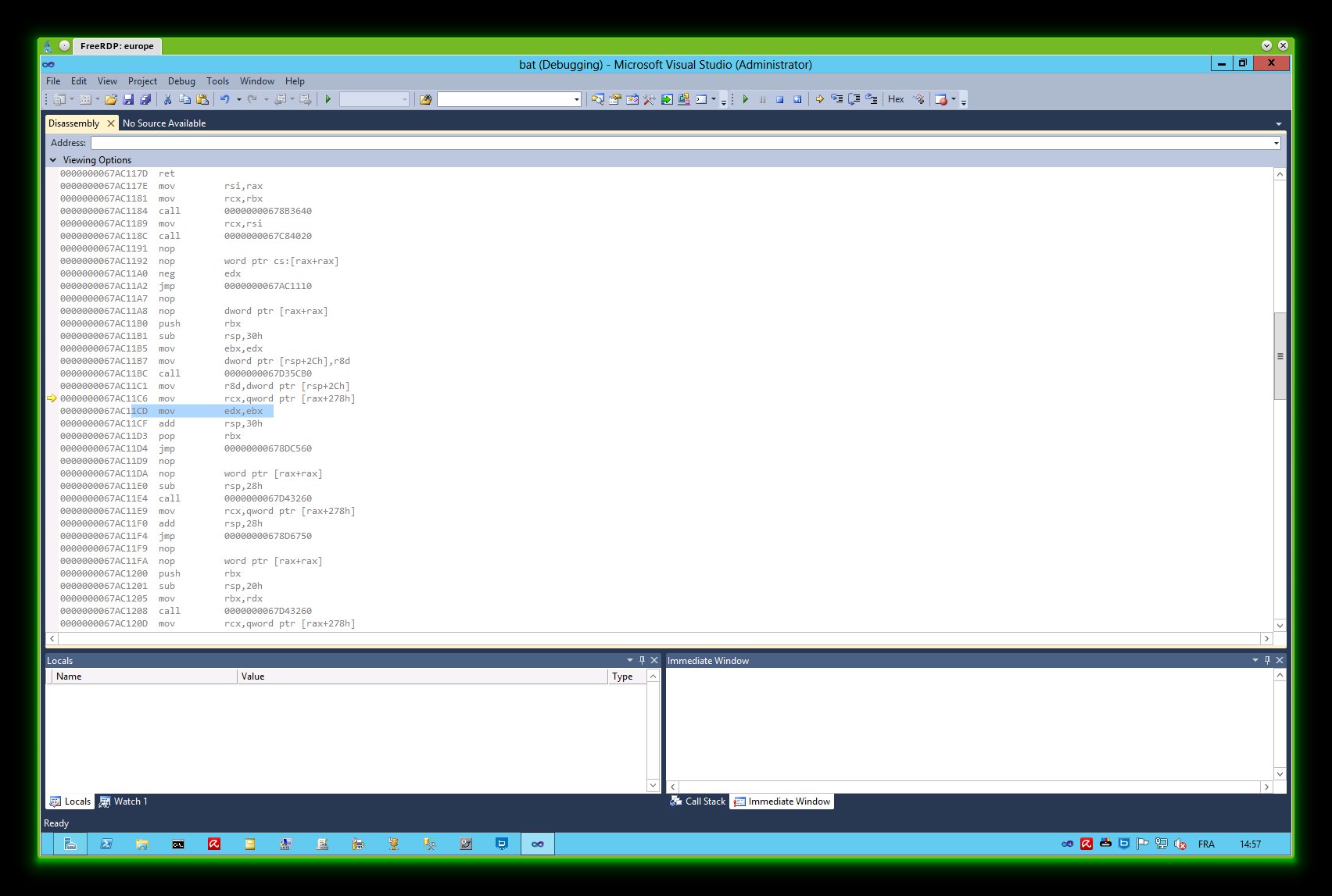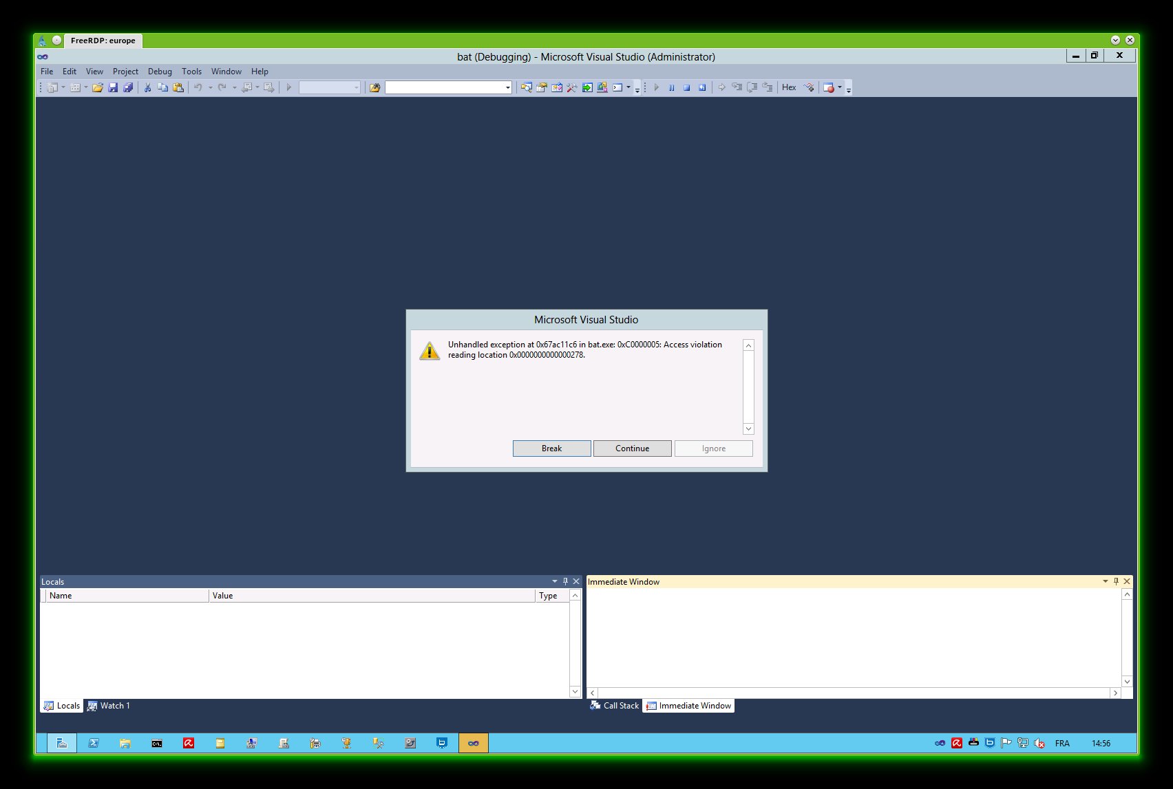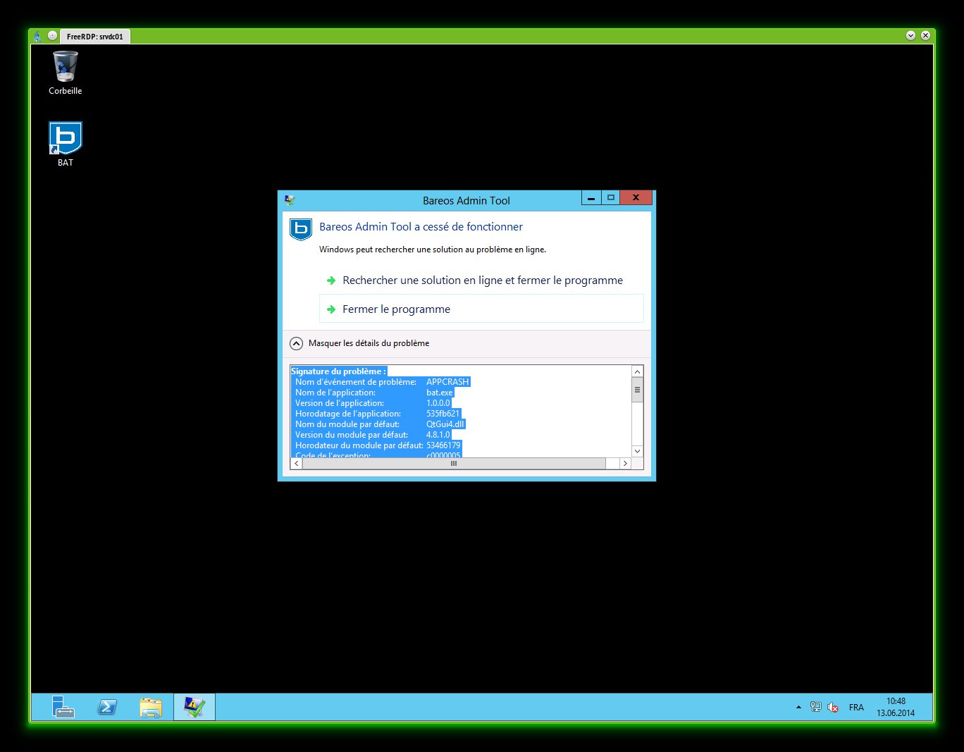 I can reproduce same type of crashes on a Windows 2012 setup in english with bareos 12.4.6 (also under maintenance) Problem signature: Problem Event Name: APPCRASH Application Name: bat.exe Application Version: 1.0.0.0 Application Timestamp: 522db037 Fault Module Name: QtGui4.dll Fault Module Version: 4.8.1.0 Fault Module Timestamp: 522cc5d1 Exception Code: c0000005 Exception Offset: 00000000003c11c6 OS Version: 6.2.9200.2.0.0.272.7 Locale ID: 2055 Additional Information 1: afc5 Additional Information 2: afc556dcc1af9e7e03df23eb813d28c1 Additional Information 3: 87bd Additional Information 4: 87bdc48a0ece0057f7add38707b3bd28 Read our privacy statement online: http://go.microsoft.com/fwlink/?linkid=190175 If the online privacy statement is not available, please read our privacy statement offline: C:\Windows\system32\en-US\erofflps.txt Hopefully on this server I've visual studio debugger express, so clicking on debug I'm getting the two new screenshot) Unhandled exception at 0x67ac11c6 in bat.exe: 0xC0000005: Access violation reading location 0x0000000000000278. Break reveal 0000000067AC11C1 mov r8d,dword ptr [rsp+2Ch] >> 0000000067AC11C6 mov rcx,qword ptr [rax+278h] 0000000067AC11CD mov edx,ebx |