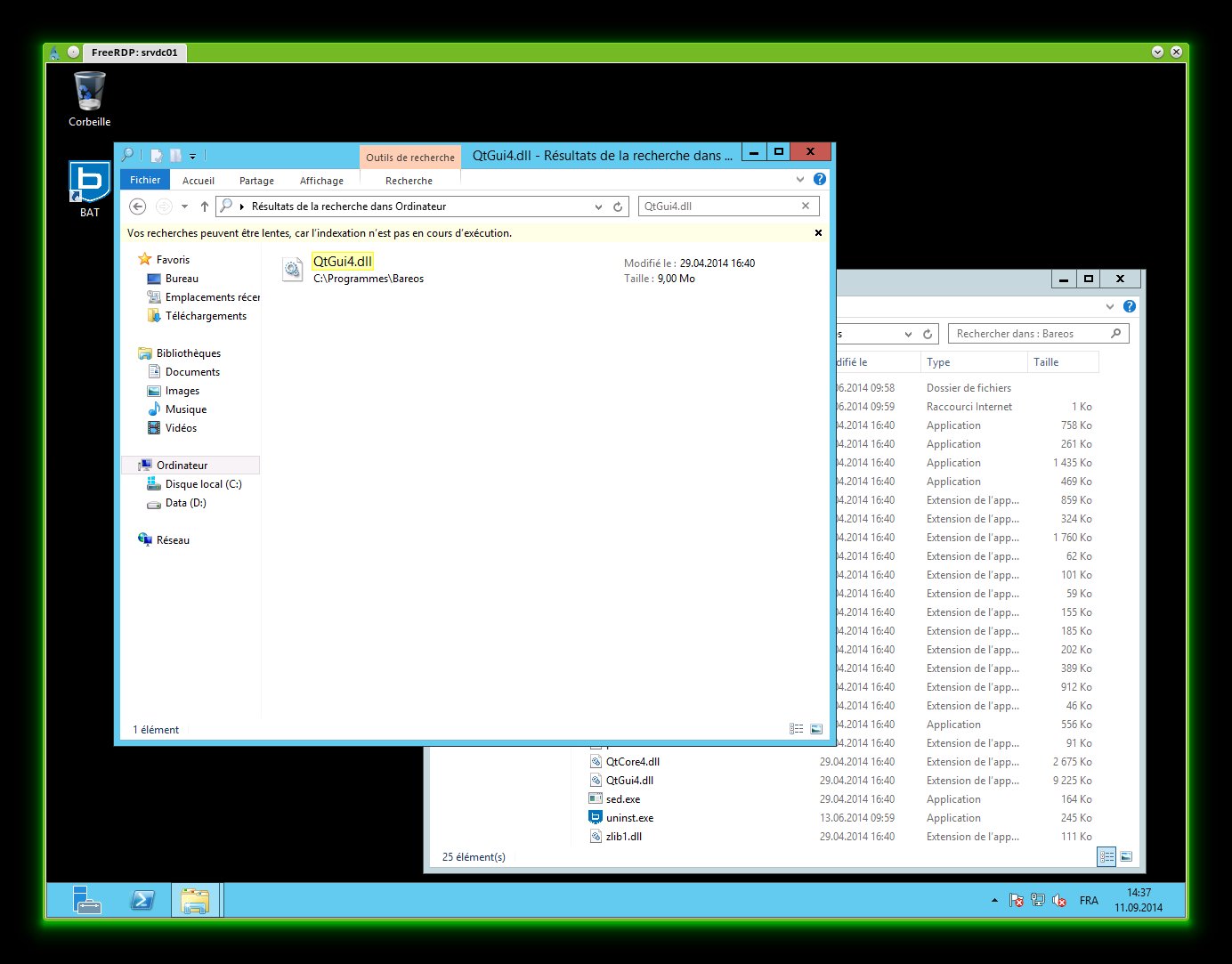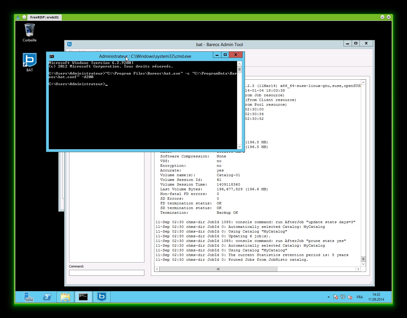 Ok I've a similar case (bat hanging forever on launch) and if you close it you got a windows app crash report Nom d’événement de problème: APPCRASH Nom de l’application: bat.exe Version de l’application: 1.0.0.0 Horodatage de l’application: 535fb621 Nom du module par défaut: QtGui4.dll Version du module par défaut: 4.8.1.0 Horodateur du module par défaut: 53466179 Code de l’exception: c0000005 Décalage de l’exception: 00000000003db7c4 Version du système: 6.2.9200.2.0.0.272.7 Identificateur de paramètres régionaux: 4108 Information supplémentaire n° 1: afc5 Information supplémentaire n° 2: afc556dcc1af9e7e03df23eb813d28c1 Information supplémentaire n° 3: 98fa Information supplémentaire n° 4: 98fa78db2b56ac493a1e703eed6e6420 Windows 2012 Server / French edition Bareos subscription 13.2.3 x64 installed It's behave 100% of time the same. Run -> hang -> crash on close bconsole on the same server work as expected ;-) |