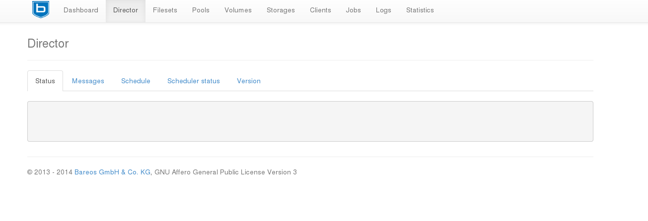 | Description | I log in to bareos-webui. On the card Director in subcards: Storage, Messages, Schedule, Scheduler status, Version ther isn't any information - only gray blank field. Screenschot attached. | ||||