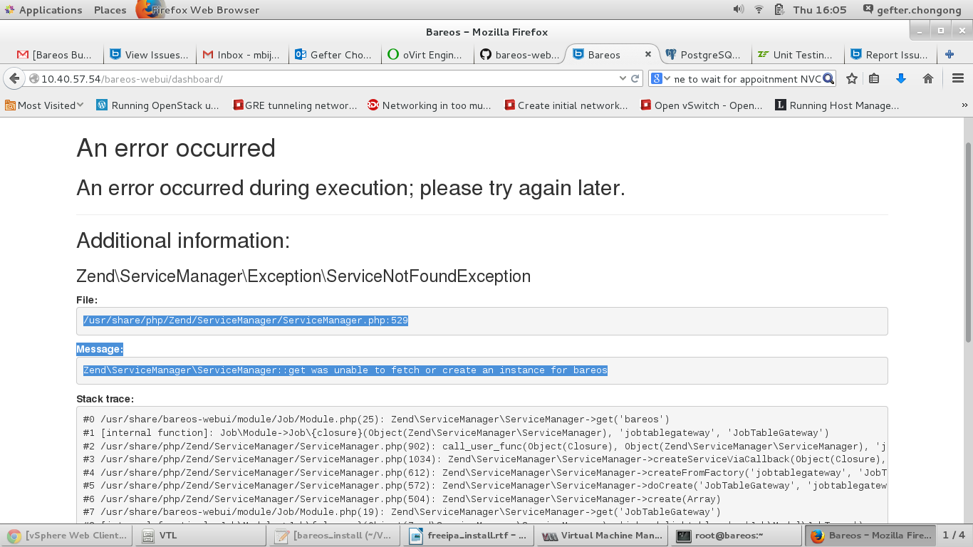 | Description | I see issue 0000429 has been resolved, but I just tried installing the bareos gui and run into this. The connection test is failing. Cannot get to the web login page. What was the solution? /usr/share/php/Zend/ServiceManager/ServiceManager.php:529 Message: Zend\ServiceManager\ServiceManager::get was unable to fetch or create an instance for bareos | ||||