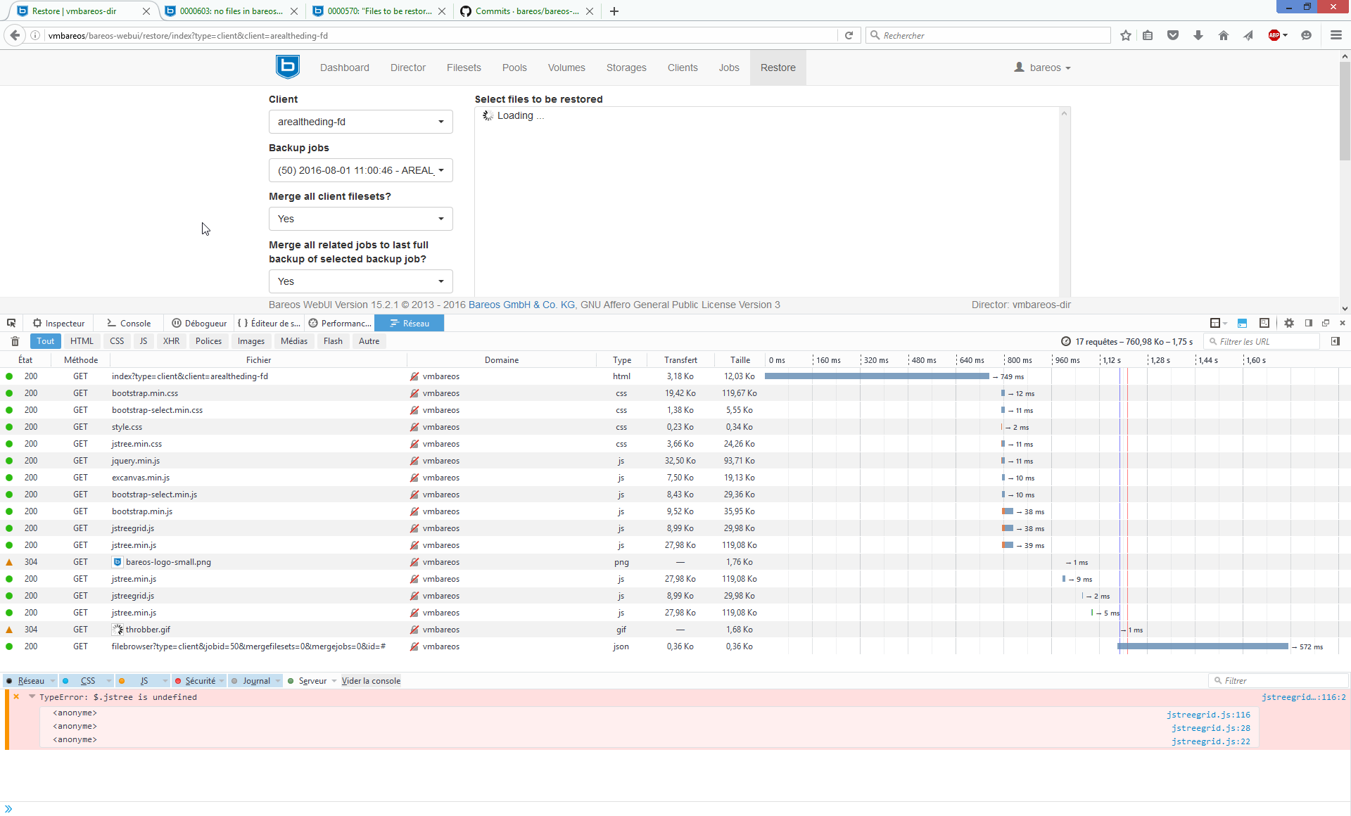 | Description | On a fresh bareos + webui install (migrated from bacula + webacula) a javascript error happens on the restore page (cf. screenshot and stack trace) It never shows on Chrome 51 or I.E. 11, and about 95% time on Firefox 47. I first thought it might be somewhat related to bug 0000570 but I now guess it is a javascript bug, rather than a database problem. | ||||